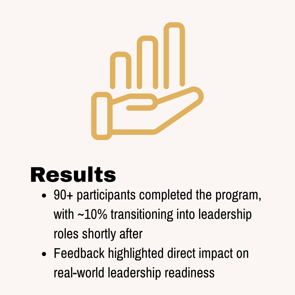 Within the first year of launch, over 90 participants completed the program, with approximately 10% transitioning into leadership roles shortly after.